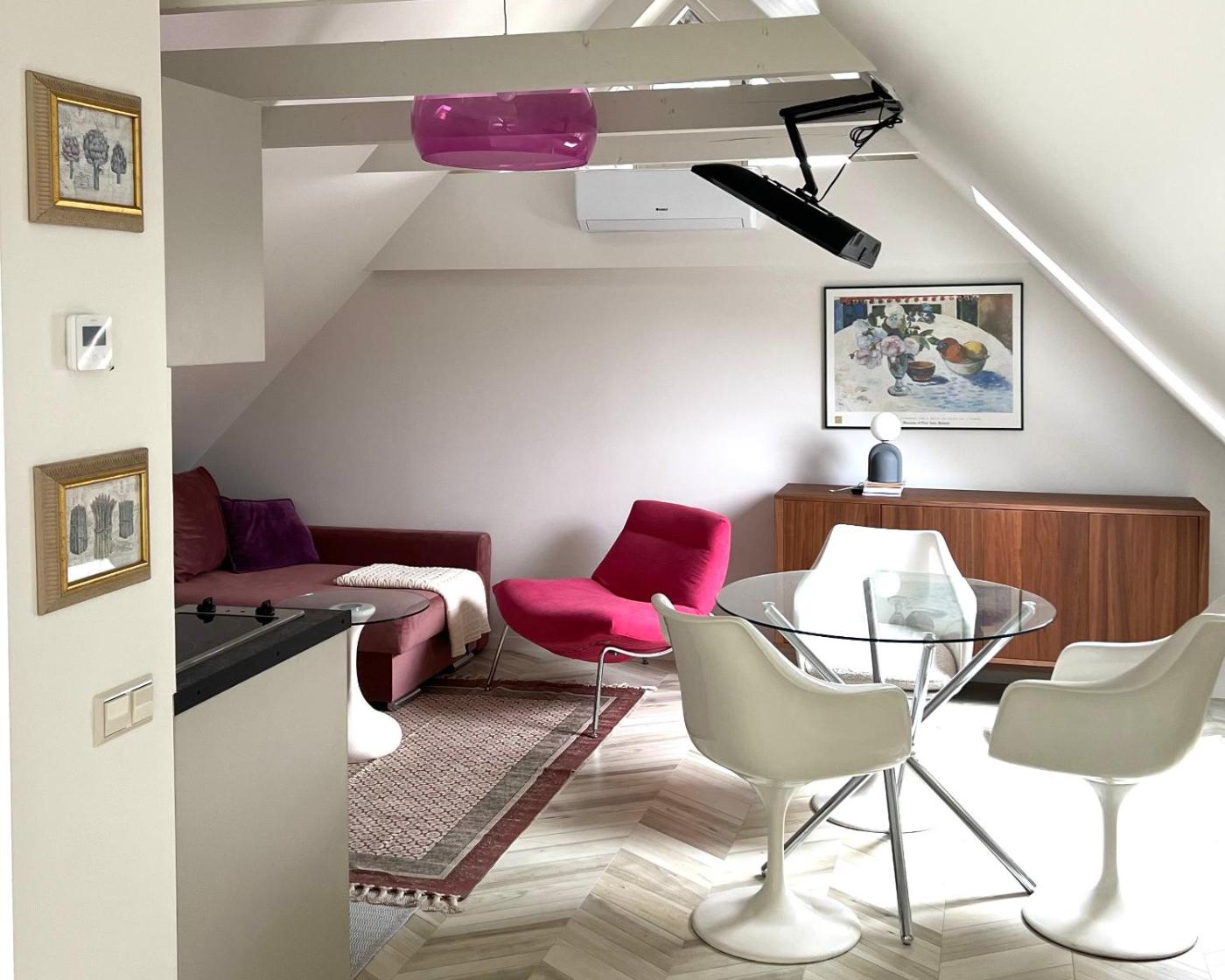 Three-Bedroom Apartment. Bright, spacious apartment occupying the entire attic floor. There is a living room with a seating area, a dining area and a bathroom. ;