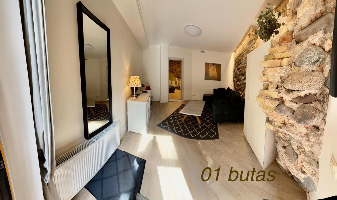 Apartment without Windows. This apartment is situated in the basement and features no windows, there are glass doors. An air-conditioning system is provided. The room features a historic stone wall. ;